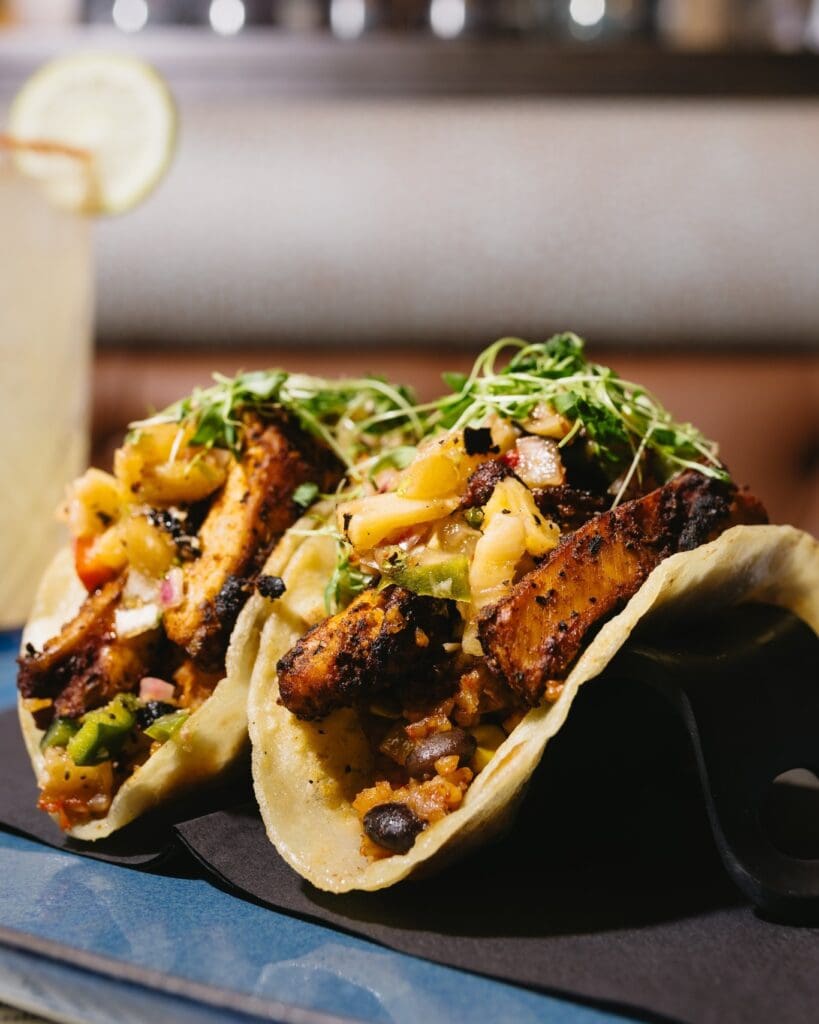 Next door at sister restaurant Dahlia Kitchen + Bar, the featured taco for December is Blackened Chicken. Two grilled white corn tortillas are filled with blackened chicken, dirty rice, pineapple salsa and fresh cilantro.