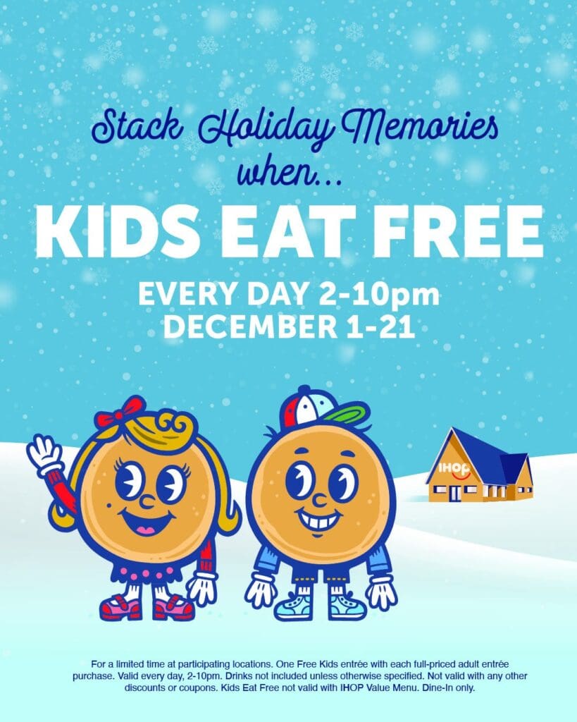 Kids eat free at IHOP from 2 to 10 p.m. daily through Dec. 21. Get one free kids entree with each full-priced adult entree purchase for dine-in only.