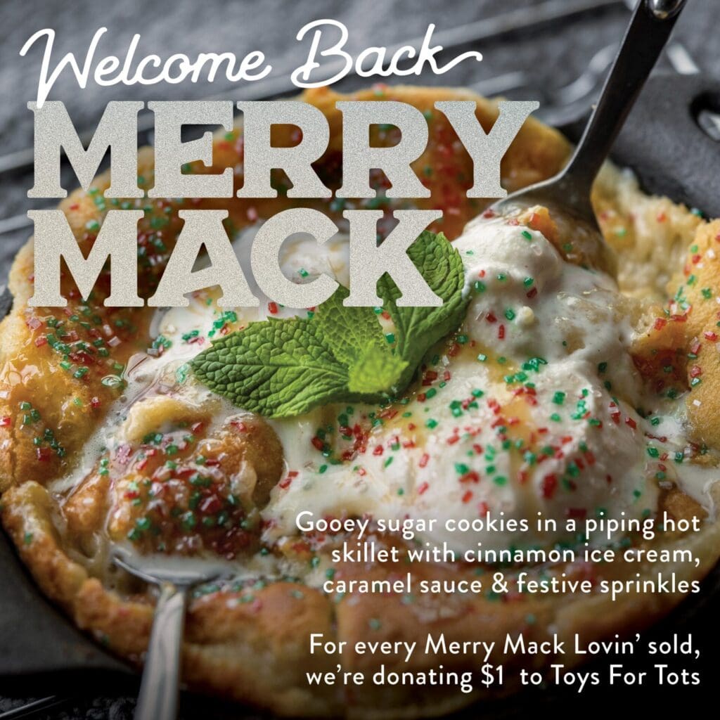 Seasonal treats and cocktails are on the menu at MacKenzie River Pizza, Grill & Pub. The Merry Mack Lovin’ offers a treat for you and for kids in need. The snickerdoodle version is back this year and is served warm with cinnamon ice cream, caramel and festive sprinkles. For each order, $1 goes to Toys for Tots. Featured beverages include the White Christmas Mojito, Bad Santa, Kentucky Hot Chocolate, Jack Frost and three martinis: Snowghost, Gingerbread and Candy Canetini.