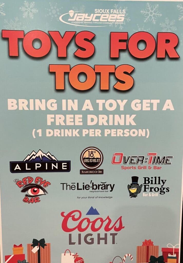 Bars that are part of the M.G. Oil family are offering a free drink with the donation of an unwrapped new toy through Dec. 20. That includes Billy Frogs, Liebrary Bar, Overtime Sports Bar & Grill, The 18th Amendment, The Red Eye Bar & Casino, Detour Bar and The Alpine Inn.