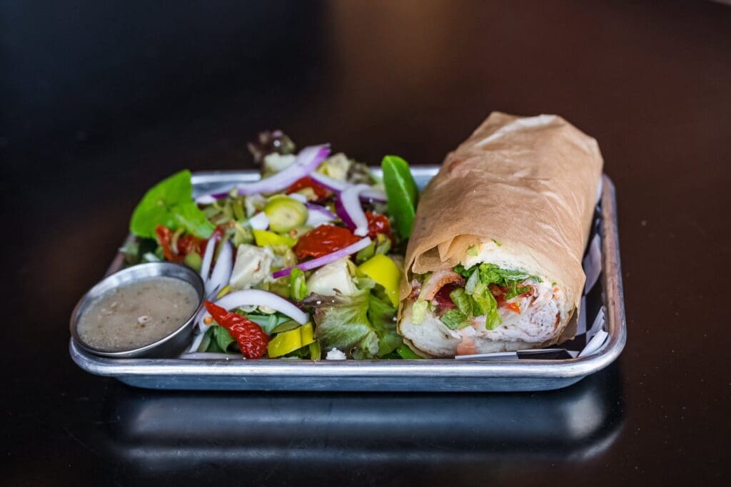 The burger of the month at the Alibi Bar & Grill is a returning favorite. The Luke Burger features a one-third-pound patty topped with Swiss cheese, and an onion ring that’s filled with shaved prime rib and drizzled with a sweet-and-spicy chile garlic sauce. It comes with a choice of side for $14.