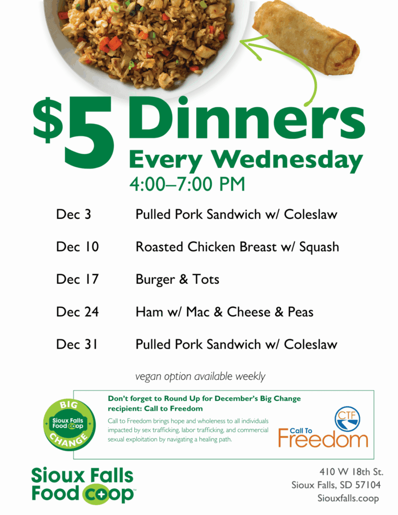 Every Wednesday, the Sioux Falls Food Co+op serves a $5 meal from 4 to 7 p.m. Here’s the lineup for this month.
