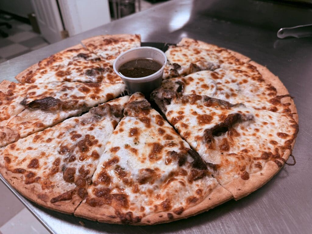 The featured pizza of the month at Waddy’s Bar & Grill in Hudson is Prime Dip. The crust is topped with a thin layer of horseradish sauce, shaved prime rib and cheese, with a side of au jus.