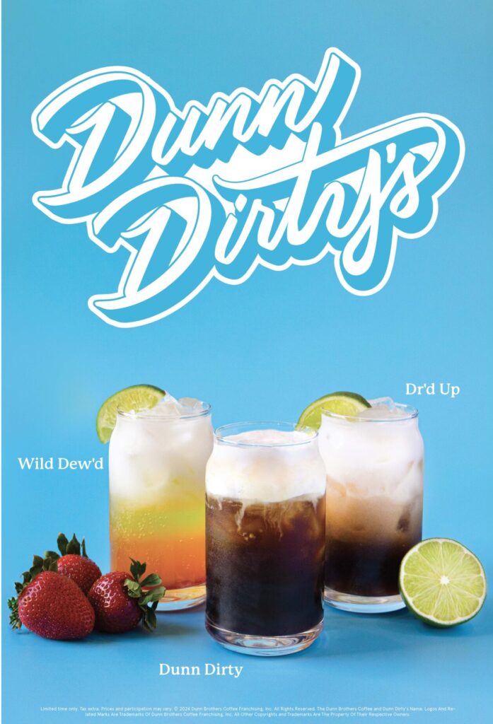 Dunn Brothers has tweaked the popular “dirty soda” trend by blending “classic soda flavors with creamy coffee and fruity elements.” The new Dunn Dirty lineup includes three drinks: The Dunn Dirty with Pepsi, nitro cold brew, salted caramel and whip; Dr’d Up with Dr Pepper, coconut milk and tropical coconut flavors; and Wild Dew’d with Mountain Dew, coconut milk and mango, strawberry and peach flavors.