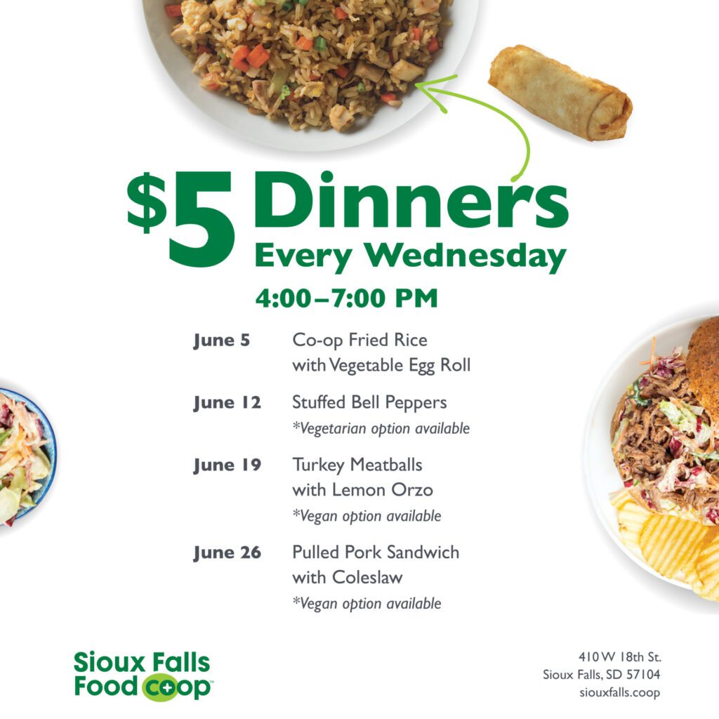 We’re a little late in sharing this month’s $5 dinner specials on Wednesday nights at the Sioux Falls Food Co+op, but there are still two offerings to try – both with vegan options.