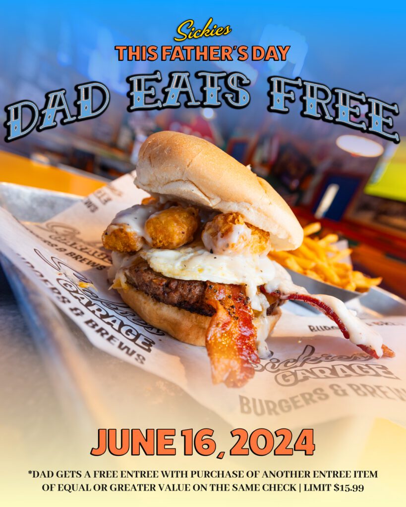 Dads eat for free on Father’s Day this Sunday at Sickies Garage Burgers & Brews. The offer is good for a free entree with the purchase of another one of equal or greater value up to $16.