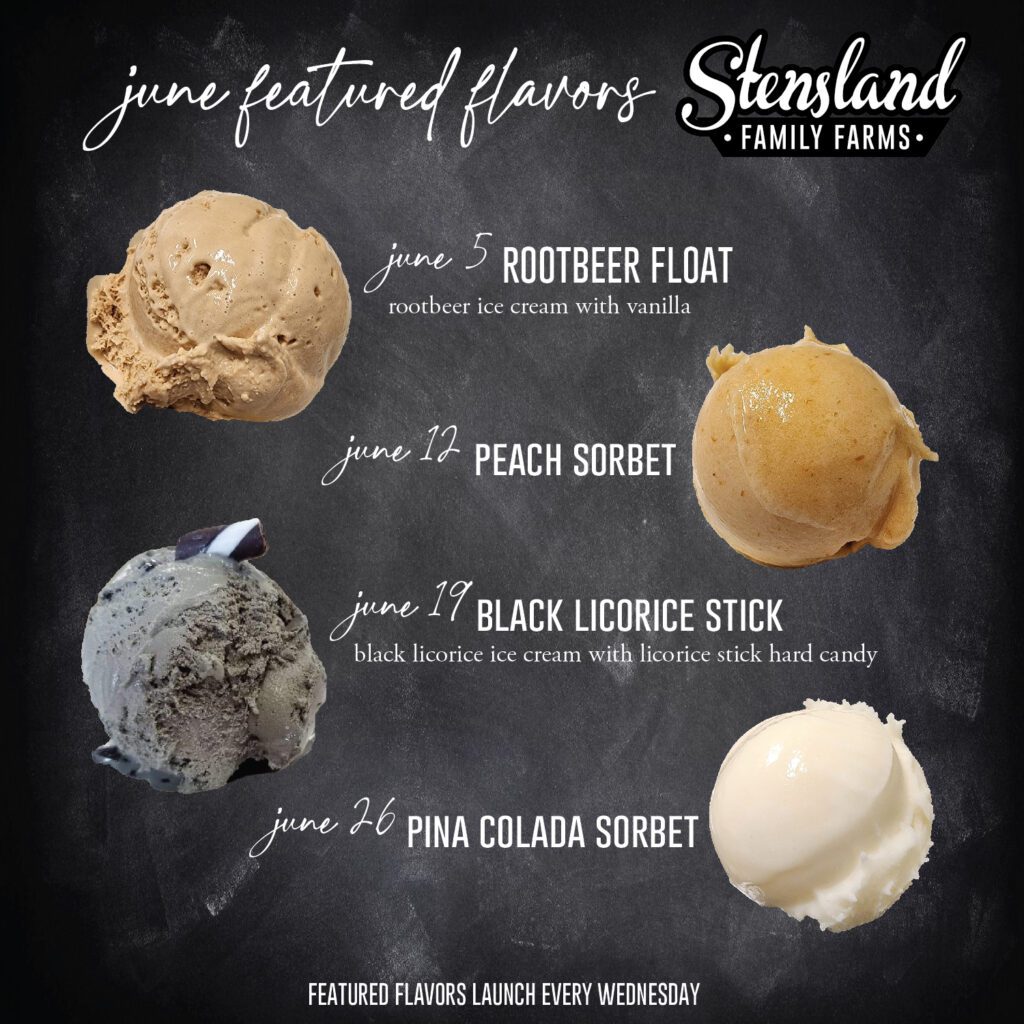 Here are the weekly featured ice cream flavors for June at Stensland Family Farms.