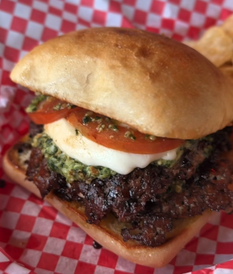 Next door at Big Sioux Burger, the burger of the month is Caprese. Two smash patties on griddled ciabatta are topped with basil pesto, fresh mozzarella, marinated tomatoes and balsamic glaze.