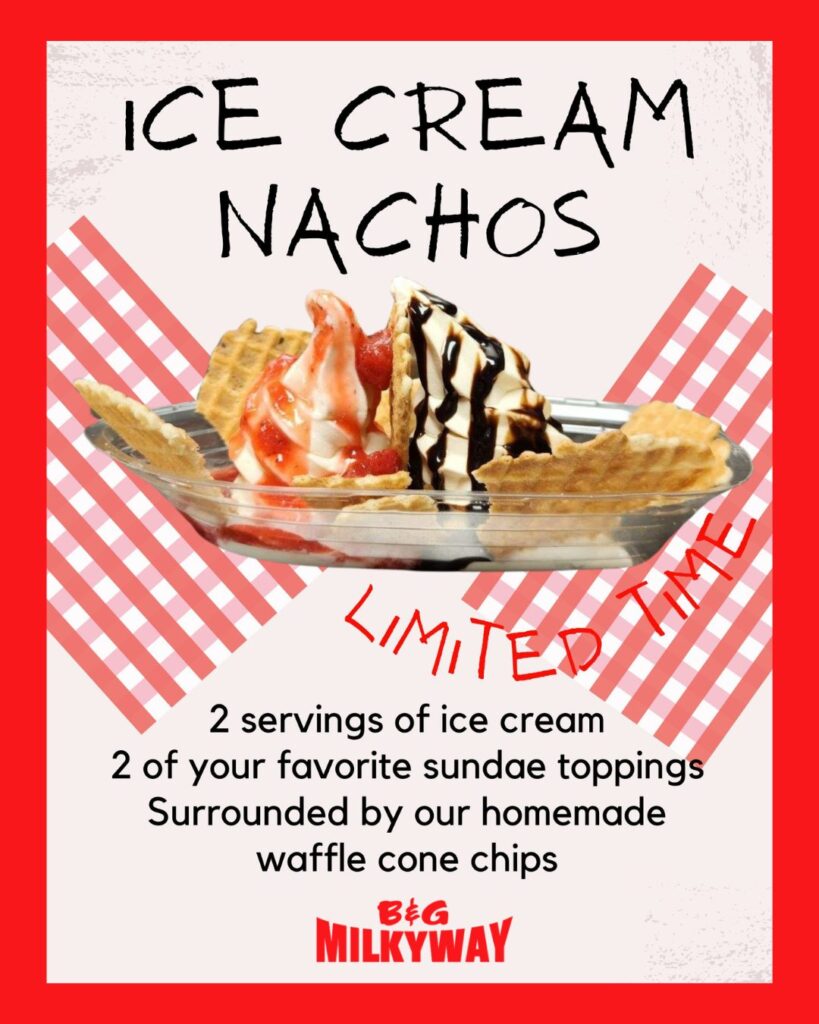 Ice Cream Nachos are back as the monthly special at B&G Milkyway locations. Get two servings of soft serve topped with any two premium toppings of your choice and handmade vanilla waffle cone chips.