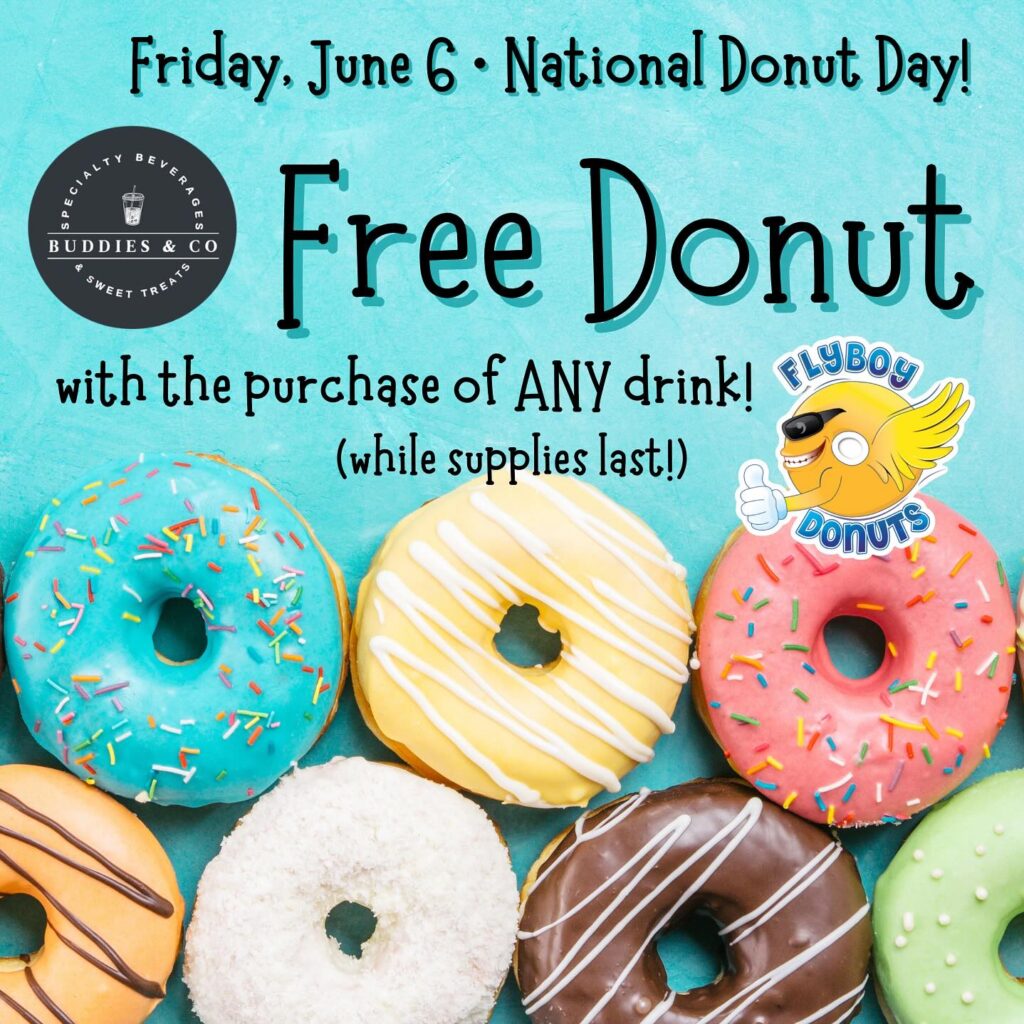 Buddies & Co. in Brandon is celebrating National Donut Day on Friday by giving away a doughnut with the purchase of any drink, while supplies last. The shop also is open now on Mondays for the summer and starts serving drinks an hour later – 8 a.m. – Monday through Saturday.
