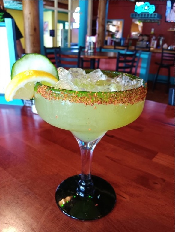 The margarita of the month at Casa del Rey is The Plankton. The green drink has 1800 Blanco Tequila, triple sec, fresh lime juice, cucumber juice and agave with Tajin seasoning on the rim of the glass and a cucumber slice garnish.