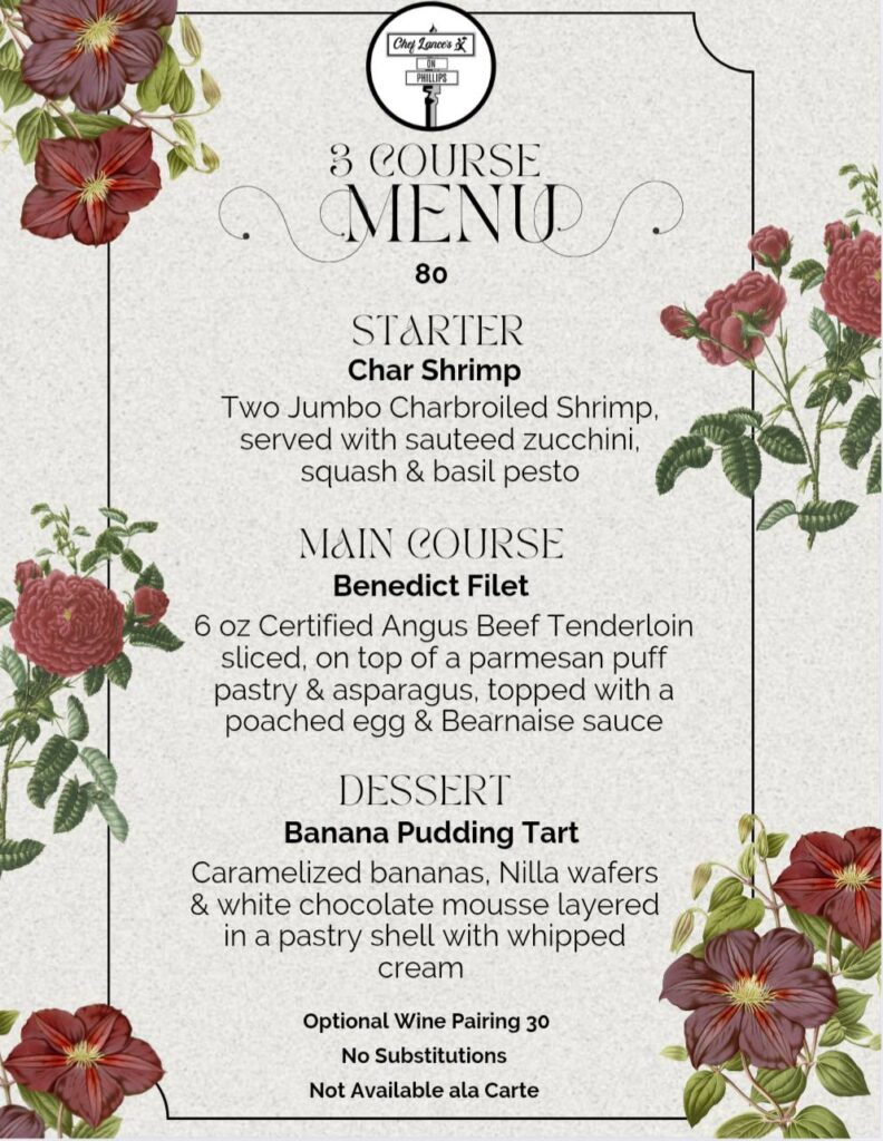Here’s the new three-course menu for June at Chef Lance’s on Phillips. The full menu is available too.
