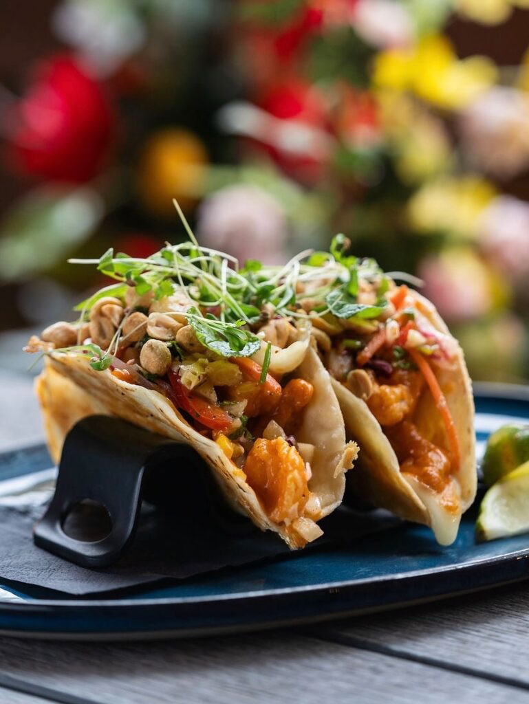 Dahlia Kitchen + Bar’s taco of the month is Thai Peanut Shrimp. Tempura fried shrimp is tossed in Thai peanut sauce and served with Oaxaca cheese, pineapple slaw and chopped peanuts.
