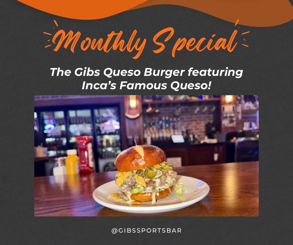 The monthly special for June at Gibs Sports Bar is the Queso Burger. Two 5-ounce never-frozen patties are topped with Inca’s queso, bacon, shredded lettuce, tortilla chips and fresh jalapeno on a pretzel bun. The burger comes with your choice of side for $18.