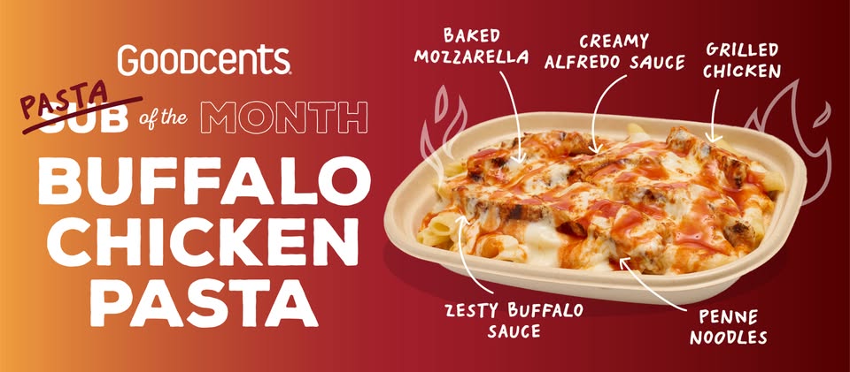 Goodcents is switching up its feature this month with a pasta instead of a sub. Get Buffalo Chicken Pasta for $8.