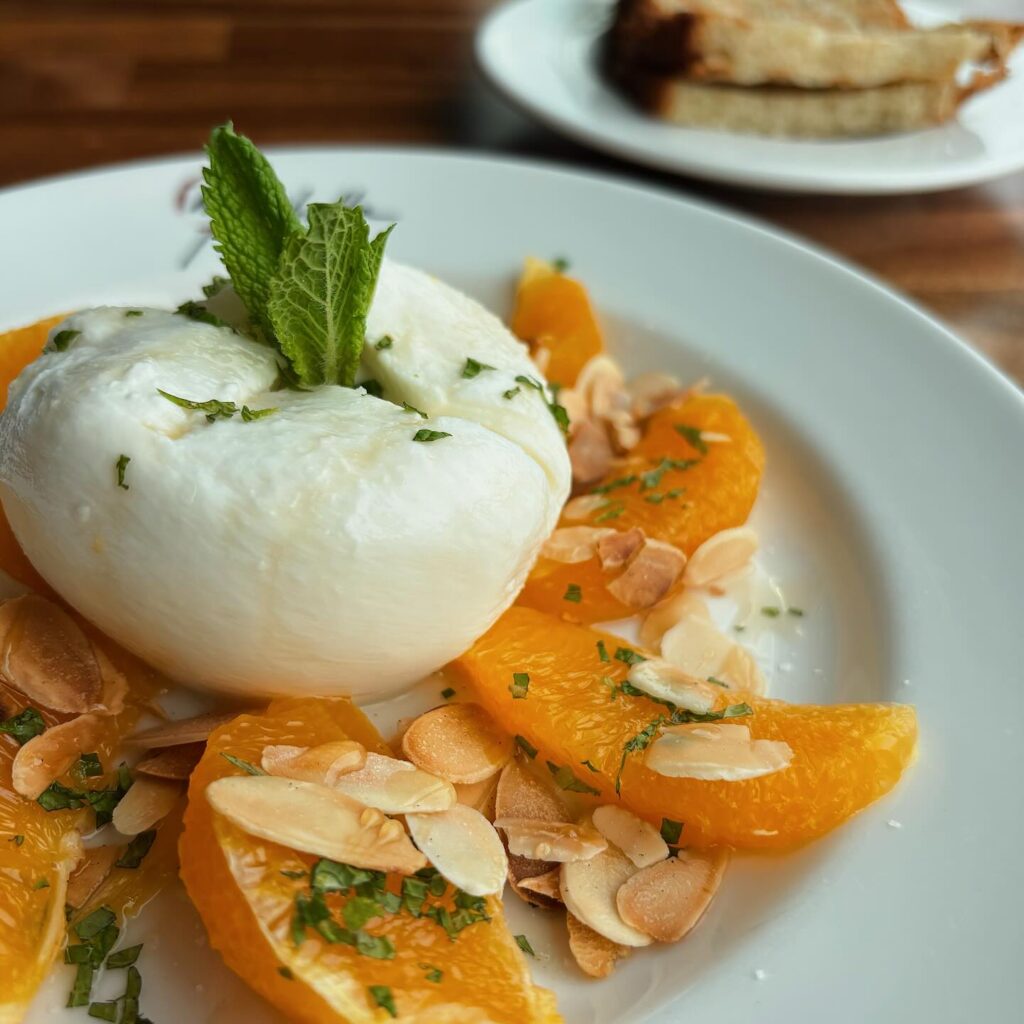 At sister restaurant Mirabella Ristorante, the monthly feature is Burrata Arancia. The cheese is served with orange, drizzled with olive oil and topped with almonds and mint.