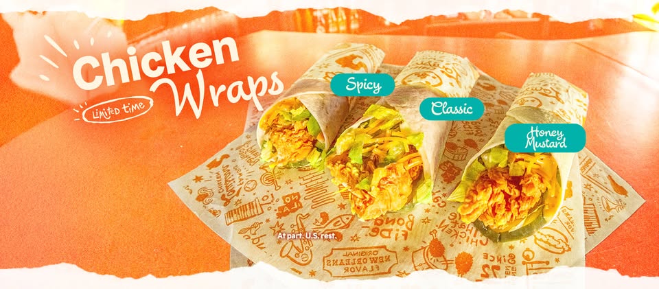 Popeyes has added chicken wraps to the menu for a limited time. A warm tortilla is stuffed with a chicken tender, lettuce, shredded cheese and pickles with a choice of classic, spicy or honey mustard spread. They cost $4 each. The national chain also has a summertime lineup of blueberry lemonade and teas.