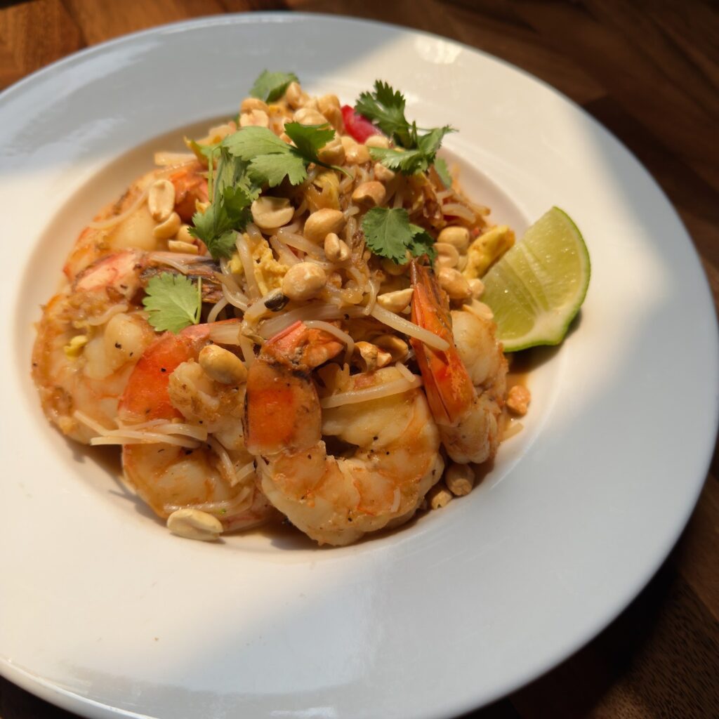 The June special at R Wine Bar & Kitchen is Shrimp Pad Thai with shrimp, scrambled egg, bean sprouts, chives and rice noodles tossed in Thai stir-fry sauce, topped with roasted peanuts and served with a wedge of lime.