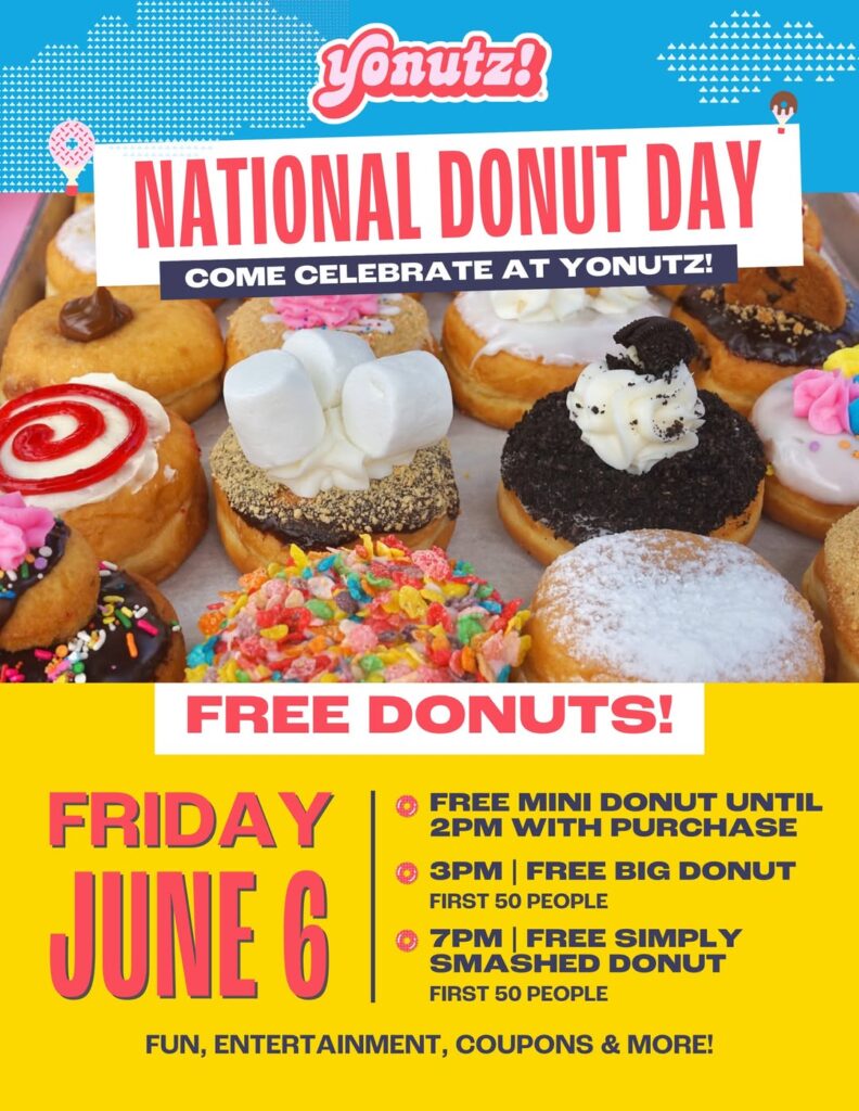 Celebrate National Donut Day on Friday at the new Yonutz at 2802 W. 41st St. Until 2 p.m., get a free mini doughnut with a purchase. Starting at 3 p.m., the first 50 guests will get a free big doughnut, and at 7 p.m., the first 50 people will get a free Simply Smashed Doughnut.