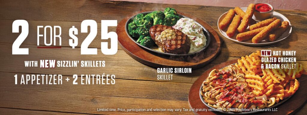 Applebee’s has a new 2 for $25 menu, featuring options of the Hot Honey Glazed Chicken & Bacon Skillet, Garlic Sirloin Skillet and a 6-ounce sirloin. In addition to an entree and side salad for each diner, they get an appetizer to share. The offer is good for dine-in, takeout or delivery. The restaurant’s Really Big Meal Deal lineup has a new addition: the Bangin’ Burger featuring a “secret sauce” made with jalapenos and bacon. Really Big Meal Deal choices are served with endless fries and unlimited fountain drink refills for $10.