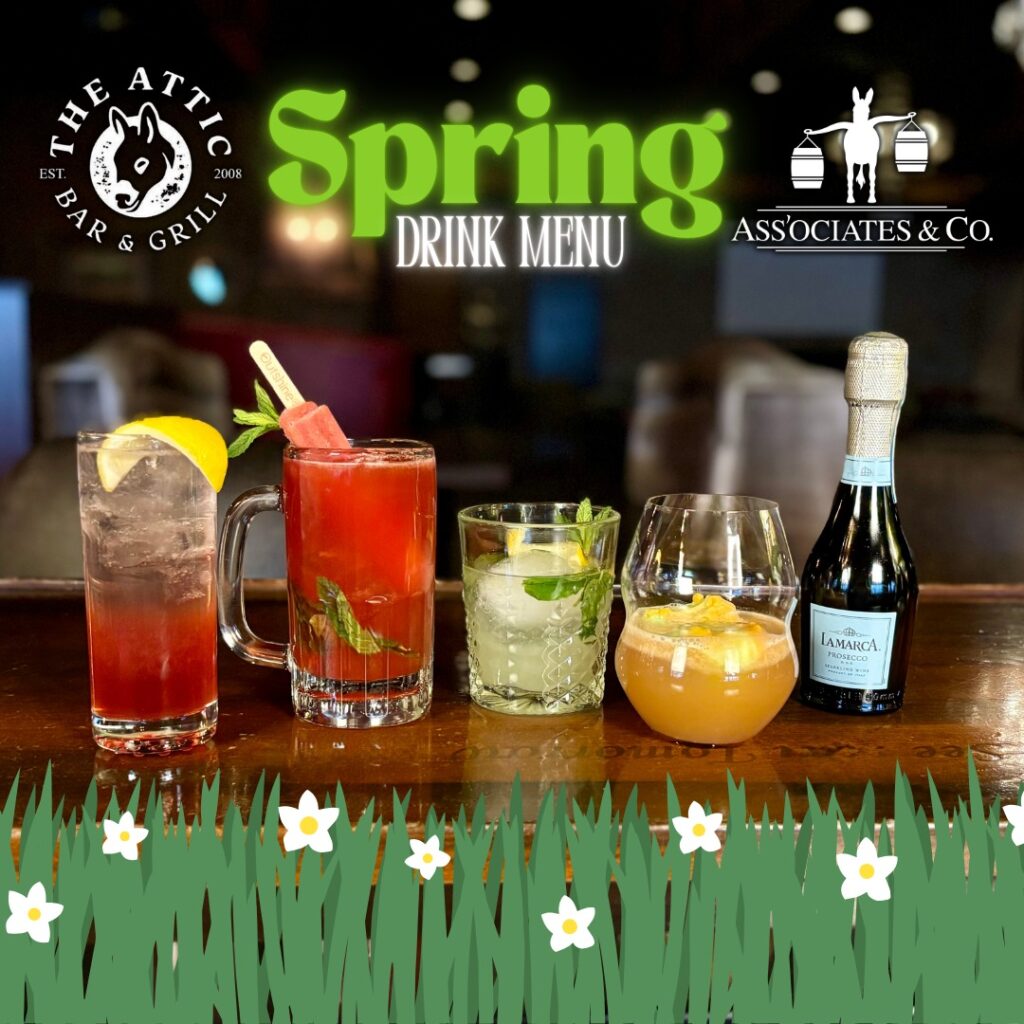 The east-side Attic Bar & Grill and the adjoining Ass’ociates & Co. have a new spring drink menu. Offerings include the Bee’s Knees, Berry A** Bourbon Popsicle, The Southside and Sweet A** Sherbert.