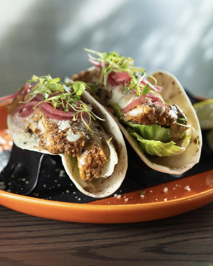 The taco of the month at Dahlia Kitchen + Bar is the fried pork loin taco. It includes panko-breaded pork loin, Oaxaca cheese, mole aioli, butter lettuce and pickled red onion.