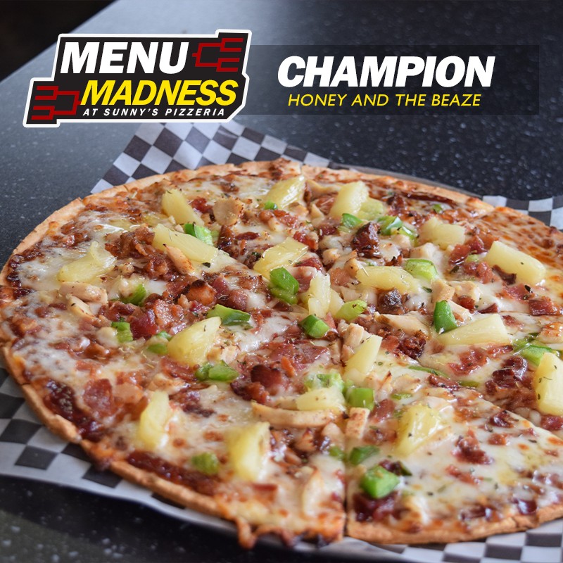 Sunny’s Pizzeria recently crowned its Menu Madness winner after a bracket-style competition of its pizzas. The winner is Honey and the Beaze. To celebrate, the restaurant is offering $5 off the winner this week. If you order online, use the code CHAMPION.