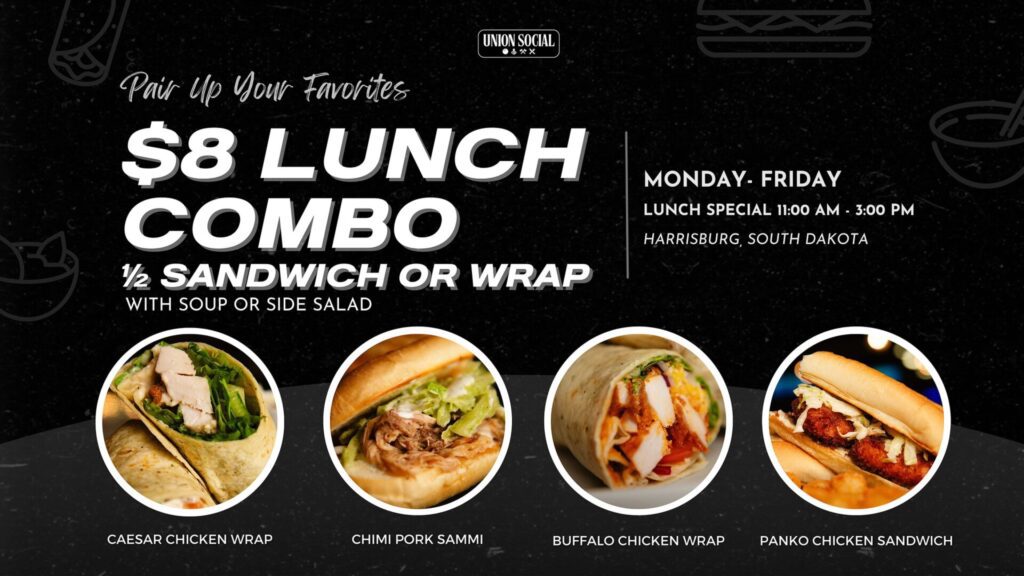 Here’s a meal deal for lunch in Harrisburg at Union Social Club. Get a half-sandwich or half-wrap with soup or a side salad for $8. Soup choices rotate between tomato bisque and chicken wild rice. The special is good from 11 a.m. to 3 p.m. weekdays.