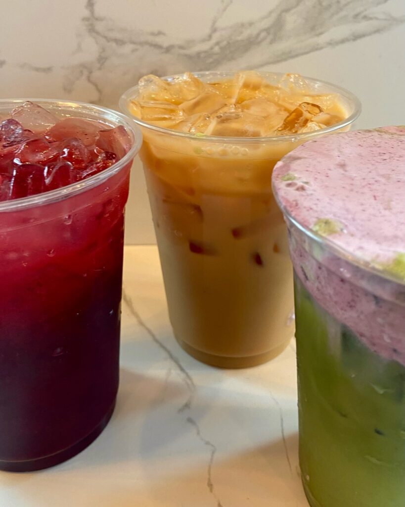 Featured drinks for April at The Breaks Coffee Roasting Co. are Fake Spring and Debra, both iced drinks. Fake Spring features espresso, orange honey syrup and lemon juice on ice, topped off with sparkling water, a garnish of rose petals and an orange peel twist. The vegan drink Debra is ceremonial-grade matcha with coconut syrup, sparkling water and vanilla coconut cream cold foam.
