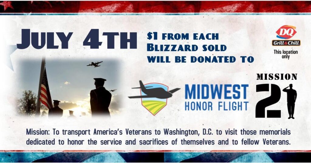 Purchase a Blizzard at the DQ Grill & Chill in Hartford on the Fourth of July, and the business will give $1 to help fund Midwest Honor Flight No. 21. Four Hartford veterans will be part of the all-expenses-paid trip to Washington, D.C.