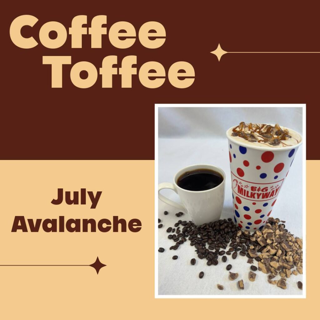 The featured Avalanche for July at B&G Milkyway is Coffee Toffee with flavors of coffee, caramel and Heath candy bars.