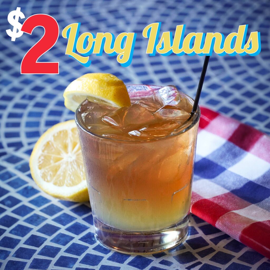 The July drink special at Applebee’s is $2 Long Islands – that’s rum, tequila, vodka, gin and triple sec all in one glass!