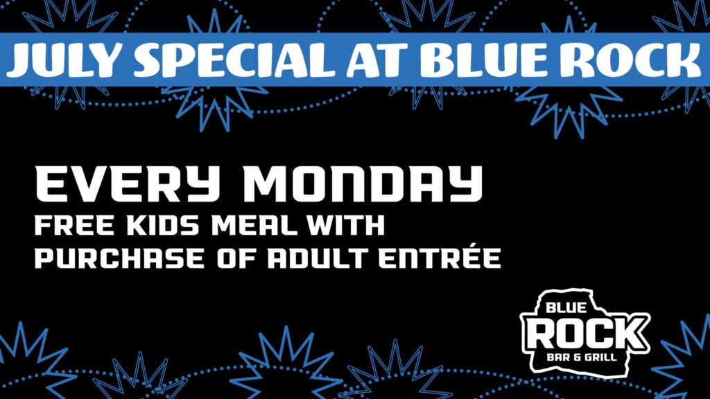 Every Monday in July, Blue Rock Bar & Grill is offering a free kids meal with the purchase of an adult entree.