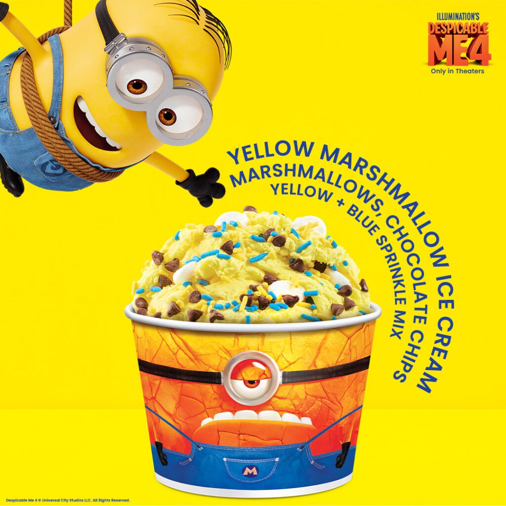 Celebrate Wednesday’s opening of “Despicable Me 4” with a special treat at Cold Stone Creamery. The Mega Minion Marshmallow Meltdown Creation features Despicamallow ice cream – marshmallow ice cream turned Minion yellow – chocolate chips, marshmallows and sprinkles. It’s available for a limited time.