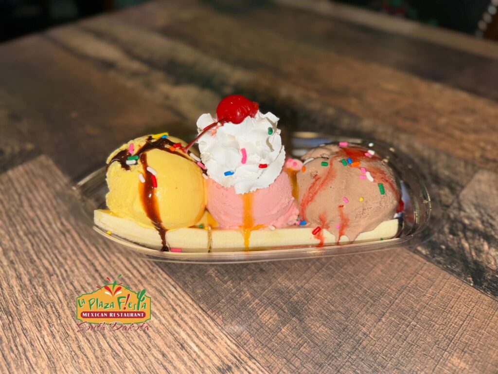 La Plaza Fiesta has teamed up with El Chamoy to start offering ice cream for dessert. In addition to banana splits, offerings include ice cream by the scoop in a dish, waffle cone or waffle bowl.