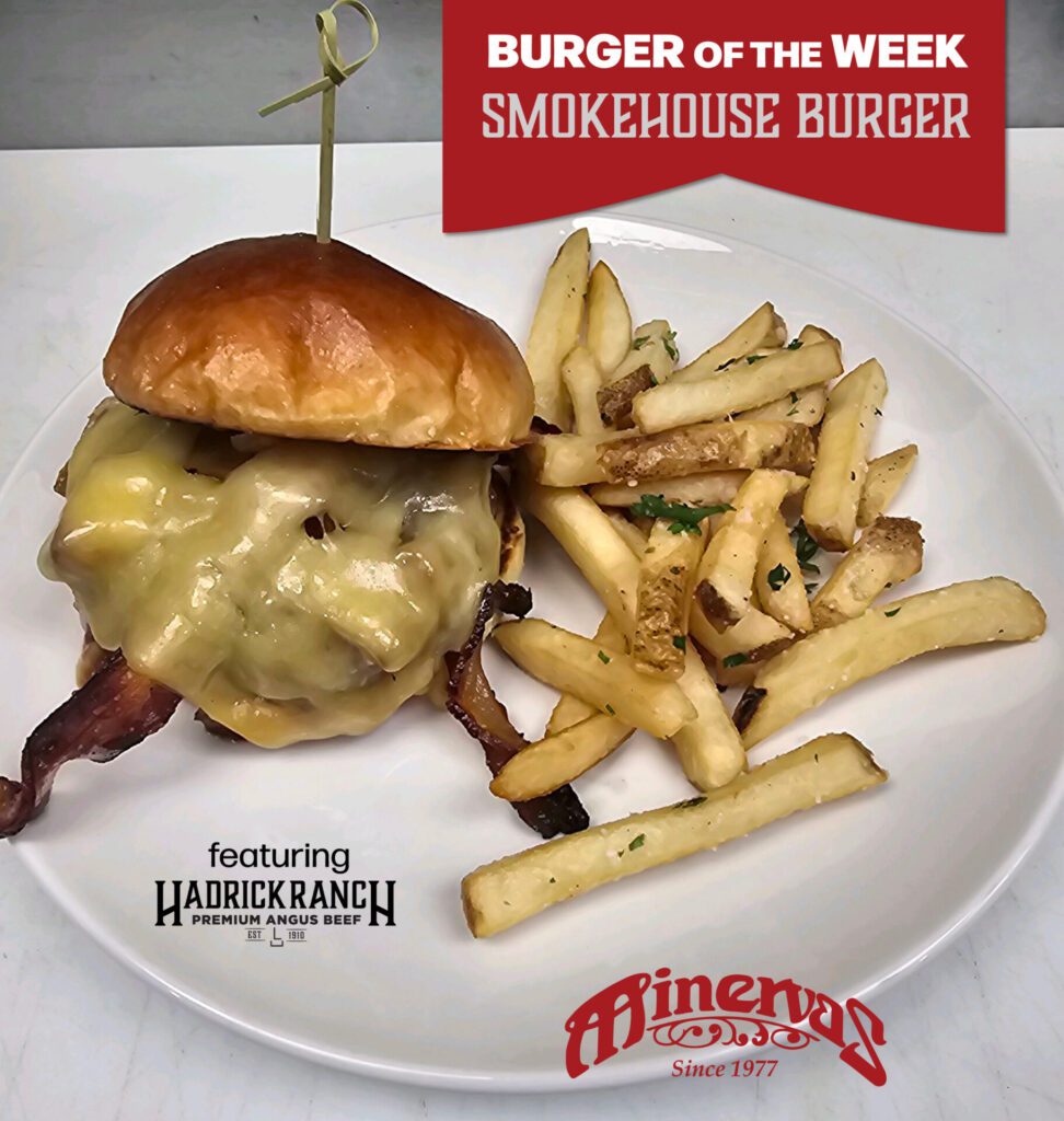 Minervas is featuring a new burger every week for lunch. First up, through Saturday, is the Smokehouse Burger. A Hadrick Ranch premium Angus beef patty is topped with bacon, barbecue sauce, caramelized onions and gouda parmesan. It’s served with herb fries. Text MINERVAS to 52236 to join the restaurant’s text club so you can find out each week’s featured burger. Note: The restaurant is closed on the Fourth of July and Sundays.