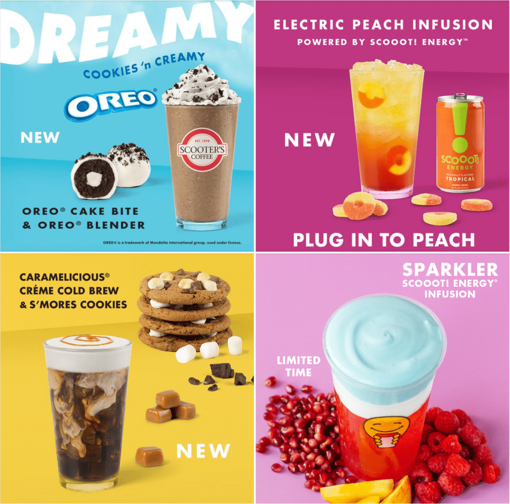 Scooter’s Coffee has teamed up with Oreo for some of its new menu items this summer. There’s an Oreo Blender and Oreo Cake Bite. Other additions include the Electric Peach Infusion, Caramelicious Creme Cold Brew and S’mores Cookie. For a limited time, the red, white and blue Scoot Energy Sparkler Infusion is available.