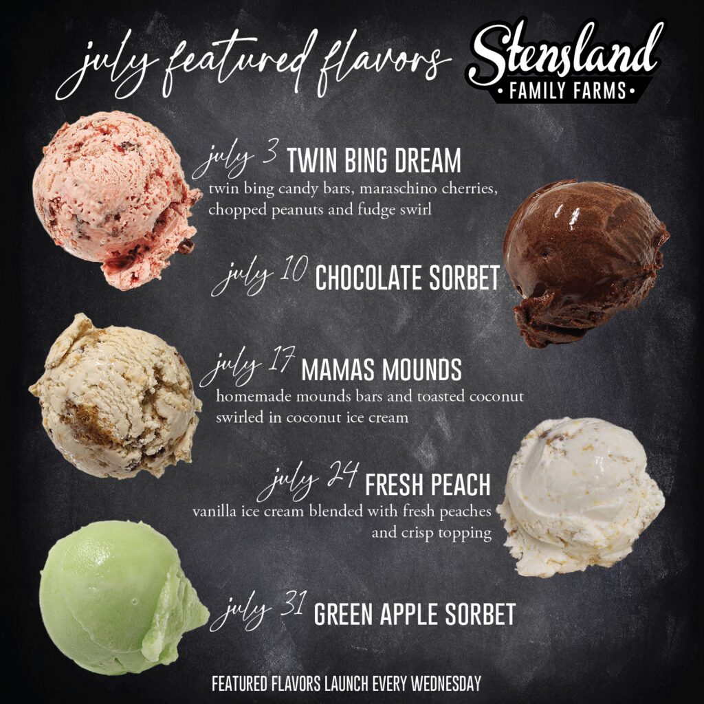 Check out the July featured flavors at Stensland Family Farms. The cult-following favorite Twin Bing Dream is up this week.