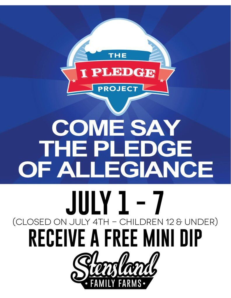 Stensland Family Farms is hosting its annual I Pledge for Ice Cream event. Kids younger than 12 who recite the Pledge of Allegiance will get a free mini dip of ice cream through Sunday. The store will be closed on the Fourth of July.