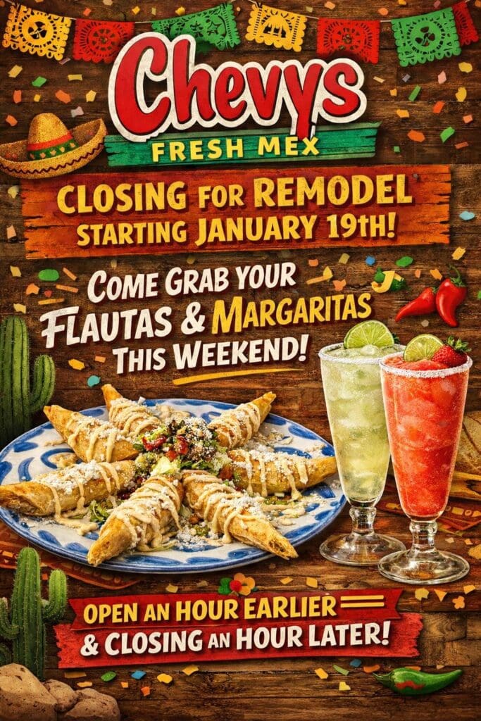 Chevy’s Fresh Mex will be closed for remodeling starting Monday. To give customers a little more time to dine before then, the restaurant is opening one hour earlier and closing one hour later on Friday and Saturday. Hours will be 10 a.m. to 10 p.m. The work includes a full kitchen remodel, a new bar rail, fresh paint and new TVs and is expected to take about 10 days, assistant manager John Reed said. Keep an eye on Facebook for updates.
