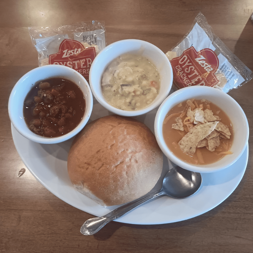 The Cookie Jar Eatery now serves soup flights. Get three cups of soup and a warm bakery bun for $10.