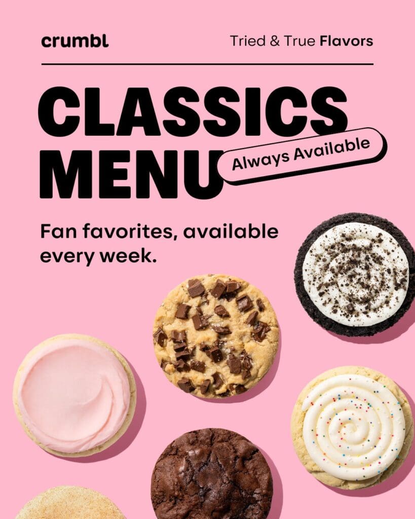Crumbl has changed its menu options. The weekly rotating desserts have been cut from seven to four, and there’s now a permanent Classic Menu with six cookies that are always available: Pink Sugar, Brownie Batter, Celebration Cake, Snickerdoodle, Chocolate Crumb, and Semi-Sweet Chocolate Chunk or Milk Chocolate Chip. Also new is Thin Thursday, which features packages of Chocolate Chip Cookie Thins.