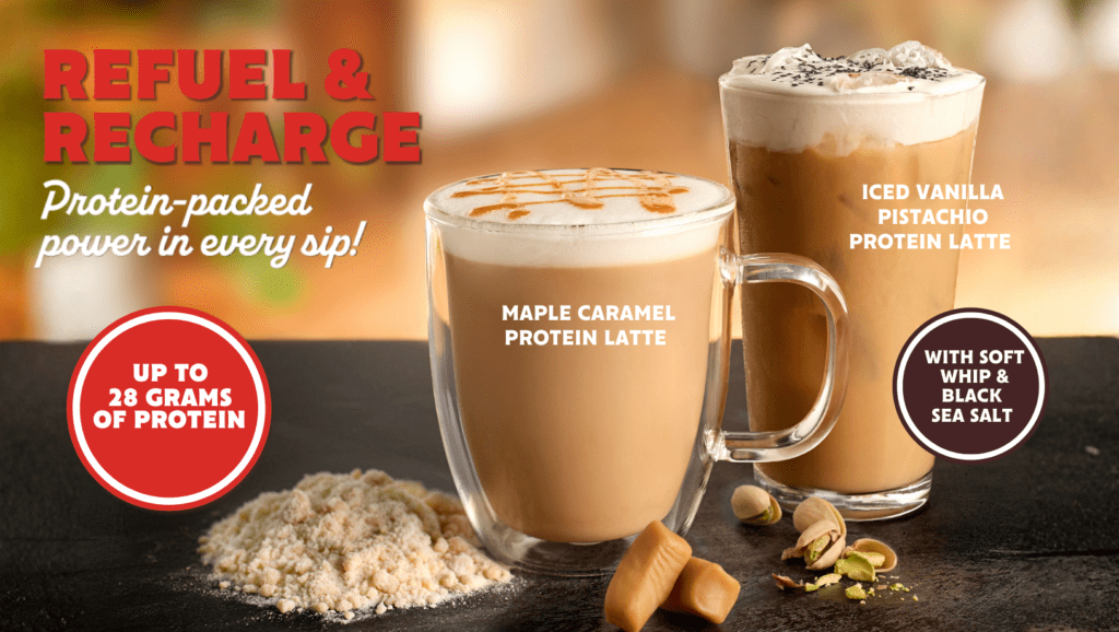 Dunn Brothers Coffee is promoting its new lattes with up to 28 grams of protein. There’s a maple caramel option and an iced vanilla pistachio.