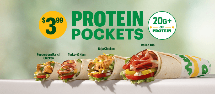 Joining the protein trend, Subway is selling Protein Pockets for $4 for a limited time. They range from 21 to 24 grams of protein, and come in four flavors: Peppercorn Ranch Chicken, Turkey & Ham, Baja Chicken and Italian Trio.