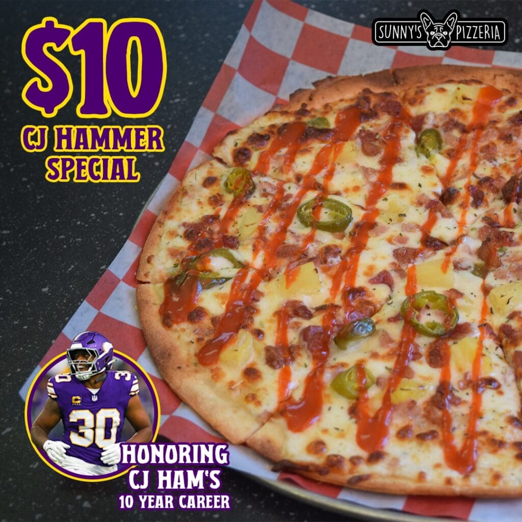 With Minnesota Vikings fullback C.J. Ham announcing his retirement from the NFL, Sunny’s Pizzeria is offering a special on the pizza named after him. During college, Ham played at Augustana University. Get a medium CJ Hammer pizza for $10 until the end of the month. For online orders, use the code HAMMERTIME.