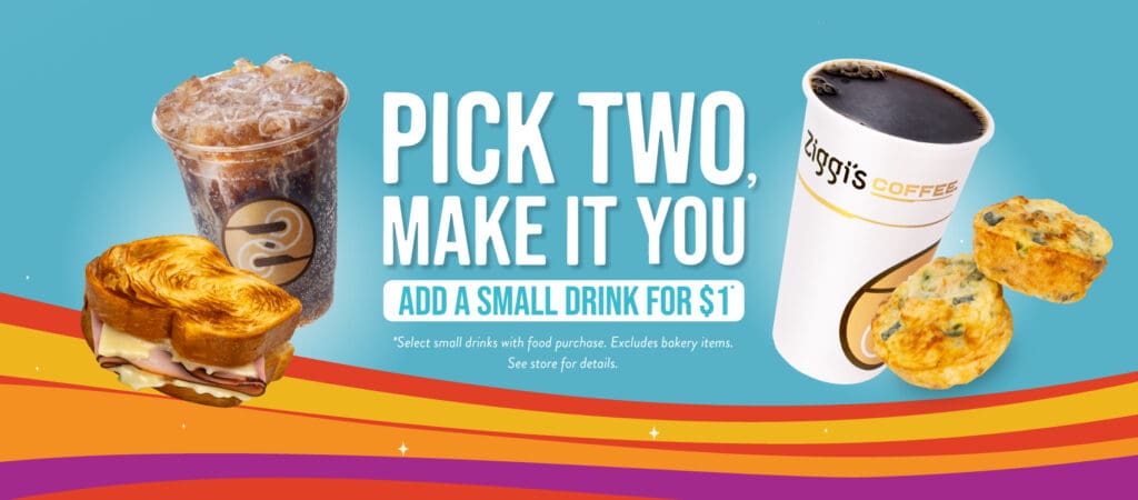 Ziggi’s Coffee has a new Pick Two menu. Buy a select food item like a breakfast burrito, egg bite or sandwich and get a small daily brew, cold brew, iced tea or dirty soda for $1. See the details here.