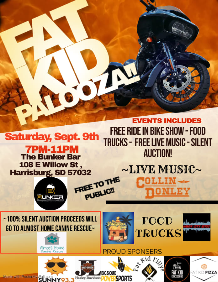 Cody Sauers of Fat Kid Fillys is celebrating his birthday, which is today, with a party Saturday in the parking lot at The Bunker Bar in Harrisburg. He’s calling it Fat Kid Palooza, and it’s open to all ages. It’s a free ride-in bike show with live music by Collin Donley. A silent auction will raise funds for Almost Home Canine Rescue. Windy City Bites and The Hangover Hut will be there selling food. Hours are 7 to 11 p.m.