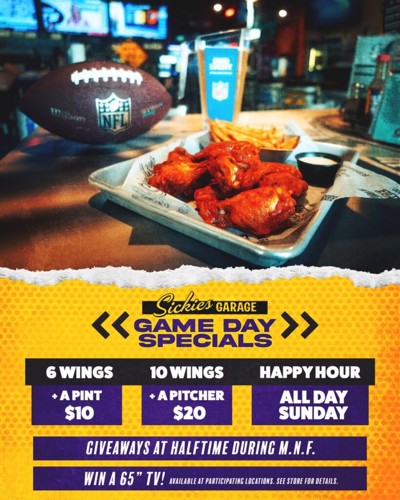 Sickies Garage is celebrating football season with specials. Get six wings, fries and a pint of domestic beer for $10 or 10 wings, fries and a pitcher of domestic beer for $20. Happy Hour Overtime runs from 7 p.m. to closing on Monday and Thursday nights and all day Sunday. On Monday nights, there will be prizes during halftime.