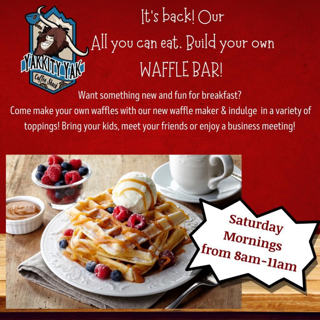The all-you-can-eat waffle bar is back at Yakkity Yak Coffee Shak. It’s served from 8 to 11 a.m. Saturdays. The coffee shop in All American Gymnastics Academy also sells doughnuts, bagels, cereal, toast, sausage, French toast sticks and coffee.