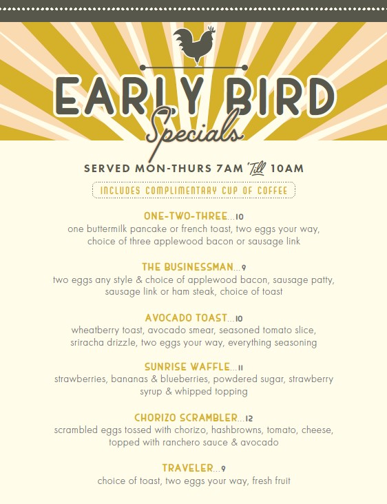 Like to get up early and go out the breakfast? The Phillips Avenue Diner has new early bird specials from 7 to 10 a.m. Monday through Thursday. The cheapest one is $9 for toast, two eggs and fresh fruit, and the most expensive plate is $12 for the Chorizo Scrambler. Each meal comes with a free cup of coffee. Here are the six options: